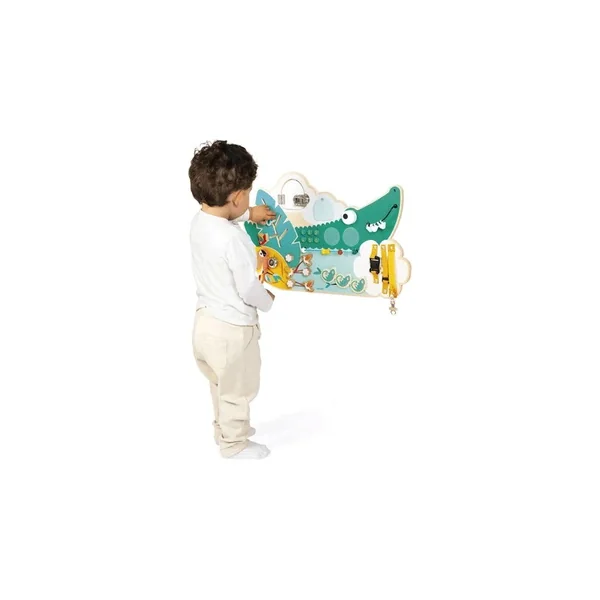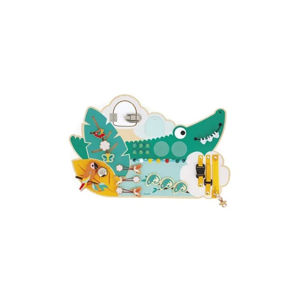 Idéal pour divertir et stimuler les petits, cette planche d’activités en forme de crocodile propose une multitude de jeux à manipuler.