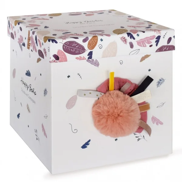 Ce lapin blanc pur, extrêmement doux et tendre, travaillé façon haute couture. Stylé, tendance « mix and match », avec son pompon terracotta, garni de touches de lange rosé, or et nude, ainsi que de passementeries fantaisies et rubans tissés savamment coordonnés, ce lapin happy fleure bon la bohême. Blotti dans une superbe boîte cadeau aux graphismes évoquant à la fois la modernité et le luxe, comme dans un écrin magique, ce doudou surprise se dévoile délicatement … les premiers instants se savourent en découvrant son pompon qui dépasse de la boîte. Un cadeau idéal dès la naissance.