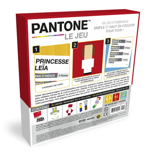 Une boîte de jeu magnifique avec un nuancier de cartes couleur. Créez des personnages reconnaissables rien qu’avec quelques couleurs. Retrouvez l’essence visuelle des plus célèbres icônes de la culture populaire, réduites à leur plus simple expression. Si c’est raté, pas de panique, les indices aideront les joueurs à trouver… une fois leur fou rire passé. Lorsqu’un joueur devine votre personnage, vous gagnez tous les deux des points ! Préparez-vous à en voir de toutes les couleurs !