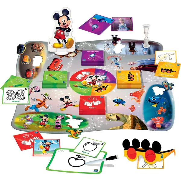 Amusez vous avec ce jeu Disney original et fabuleux plein de questions réponses qui ne cesseront de vous faire rire. Inutile de savoir lire pour s’amuser avec ce jeu comprenant des images de vos personnages préférés. Répondez rapidement aux questions sur les princesses, Mickey, Dumbo et le reste des personnages Disney, et apprenez avec les 4 héros de vos films préférés. Vous devez surmonter plusieurs épreuves de mimiques, de dessin de mémoire ou de créativité. Celui qui remporte le trophée Mickey gagne la partie .Le jeu inclut un plateau avec des personnages, 1 roulette, des cartes de 4 catégories, 1 paire de lunettes de fête, 1 tableau, 1 feutre, 1 trophée Mickey – Durée de la partie 15 à 30 min – Nombre de joueurs 2 à 4.