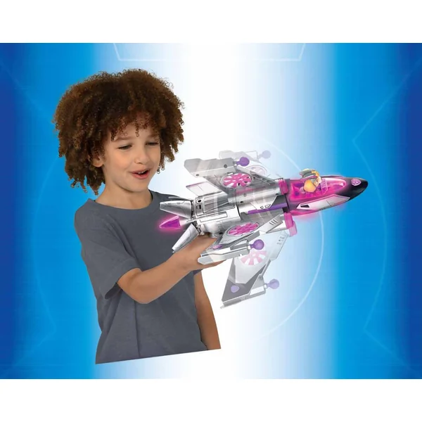 L’avion de Stella officiel du film La Super Patrouille – Le Film – Un jet interactif 2 en 1 : place la figurine de Stella à l’intérieur et appuie sur le bouton pour voir les ailes tourner à 360° et partir en mission – Avec effets sonores et lumineux et lance-projectiles – Véhicule de plus de 40 cm de long – Un jet, 1 figurine de Stella et 2 projectiles fournis – Fonctionne avec 3 piles LR03 fournies.
