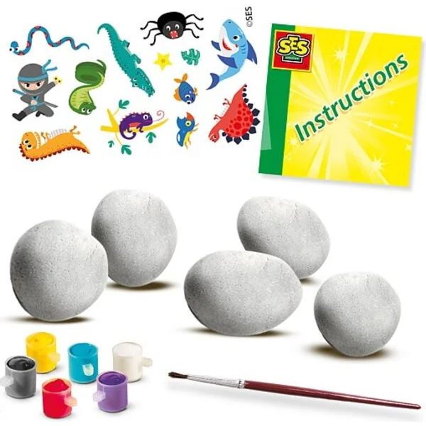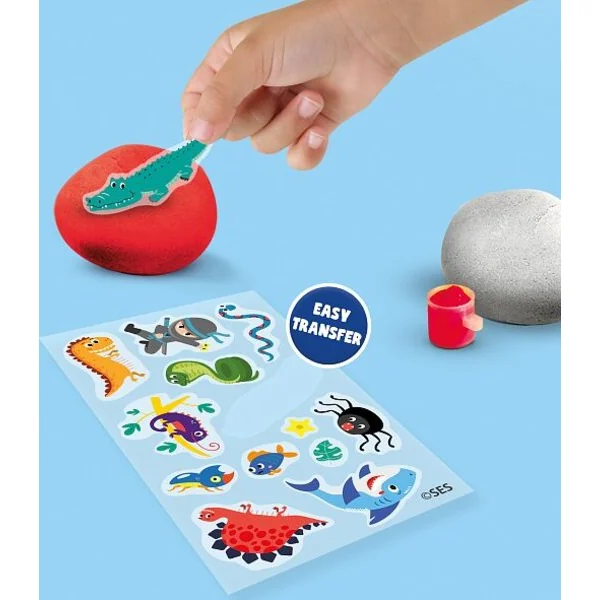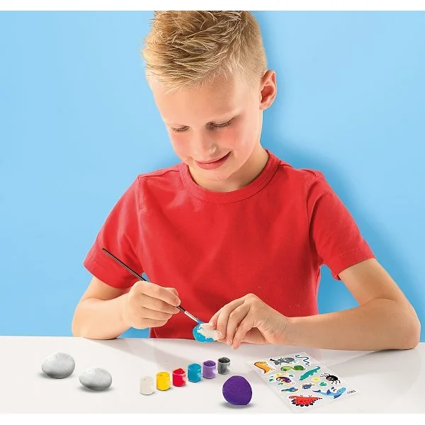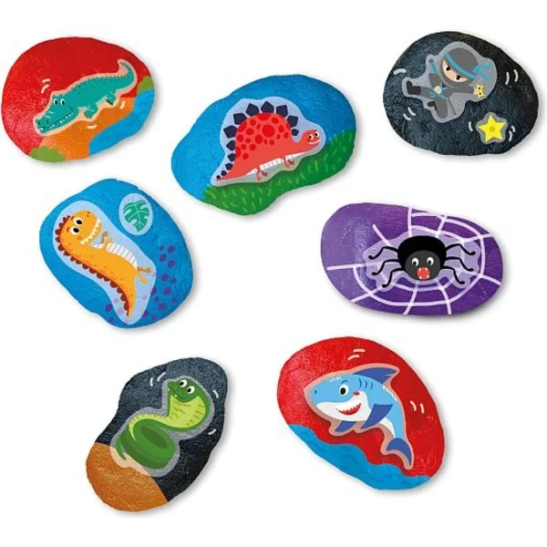 Peinture de pierres avec divers autocollants ! Peignez vos pierres dans vos couleurs préférées et décorez-les avec des autocollants comme des araignées, des dinosaures, des requins, etc.