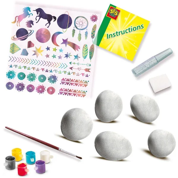 Les autocollants à frotter, la colle à paillettes et les six couleurs de peinture permettent de créer cinq superbes pierres galaxie ! Une licorne sur ses pattes arrière, des planètes ou des plumes ? Choisis tes autocollants à frotter préférés et laisse libre cours à ton imagination. Frotte-les sur l’une des pierres peintes et crée des combinaisons uniques. Et une couche de colle à paillettes rendra les pierres encore plus brillantes et magiques.