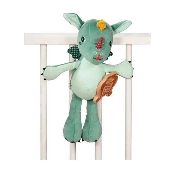 Cette peluche musicale Joe le Dragon en jersey joue la musique « Green sleeve » une fois la harpe en bois tirée. Elle s’accroche au parc grâce à une lichette.