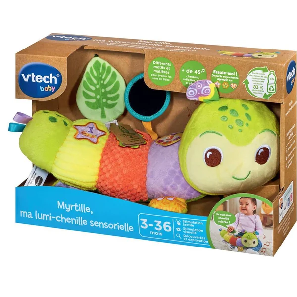 Myrtille, ma lumi-chenille sensorielle (bouteilles plastiques recyclées) – 3 – 36 mois – Une adorable chenille toute douce fabriquée à partir de bouteilles en plastique recyclé !En appuyant sur les 3 boutons lumineux, Bébé découvre les insectes, les couleurs, les formes et les chiffres et déclenche des chansons, des mélodies et des sons de la nature. De nombreuses matières et textures permettent aux tout-petits de stimuler leurs sens : tissus, éponge, velours, rubans, broderies, papier bruissant, et 2 hochets dont un miroir pour que Bébé puisse appréhender son reflet.2 modes de jeu : Apprentissages et Musique.3 chansons et 15 mélodies.Tissu fabriqué à partir de bouteilles en plastique recyclé (x8).La partie textile de ce jouet et son rembourrage comportent au moins 83% de matières recyclées.Lavable en surface uniquement. Arrêt automatique et réglage du volume sonore .Fonctionne avec 2 piles LR03 fournies.