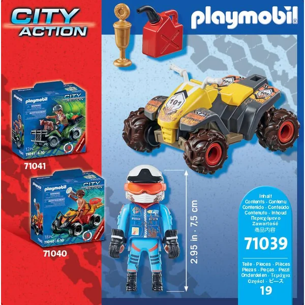 Contient un personnage et des accessoires de courses de quads. 19 pièces.