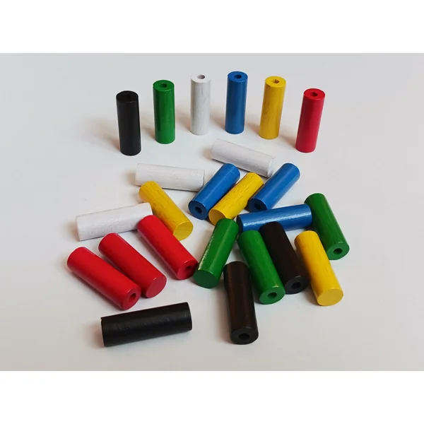 Pions peints en 6 couleurs (4 bleus, 4 verts, 4 jaunes, 4 rouges, 4 blancs et 4 noirs).