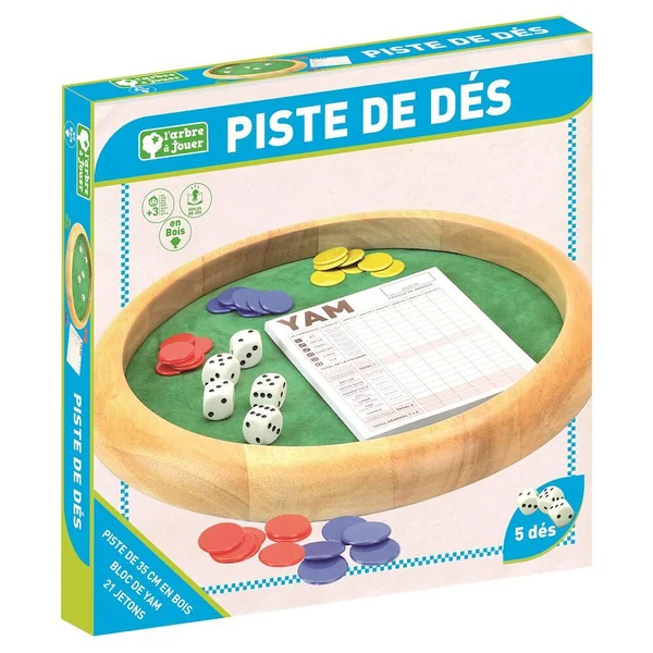 Piste de Dés en bois – Yam – 421 : piste de dés en bois avec 5 dés, 21 jetons et 1 bloc de Yam pour marquer les points – règles des jeux. Diamètre : 35 cm (épaisseur 2,6 cm).