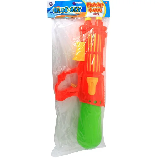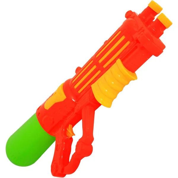 Un pistolet à eau avec double sortie et un réservoir. Il mesure 55 cm.