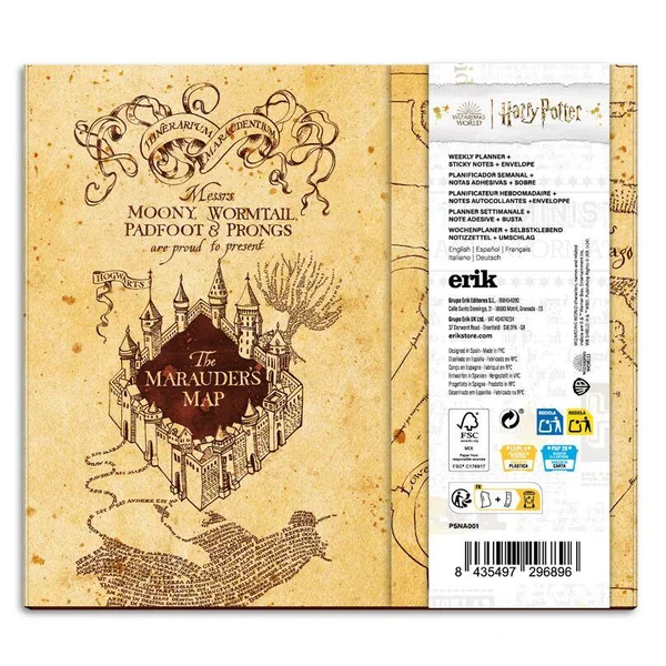 Contient un planner semainier de 181 x 152 mm, 1 bloc-notes de 92 x 90 mm, 1 bloc de notes adhésives de 52 x 62 mm et 2 blocs de notes adhésives de 20 x 52 mm. Comprend une enveloppe décorée de 89 x 151 mm fermée par une ficelle. Dimensions du produit : 190 x 167 x 23 mm plié et 500 mm ouvert. La couverture est en carton de 2 mm d’épaisseur avec fermeture magnétique.