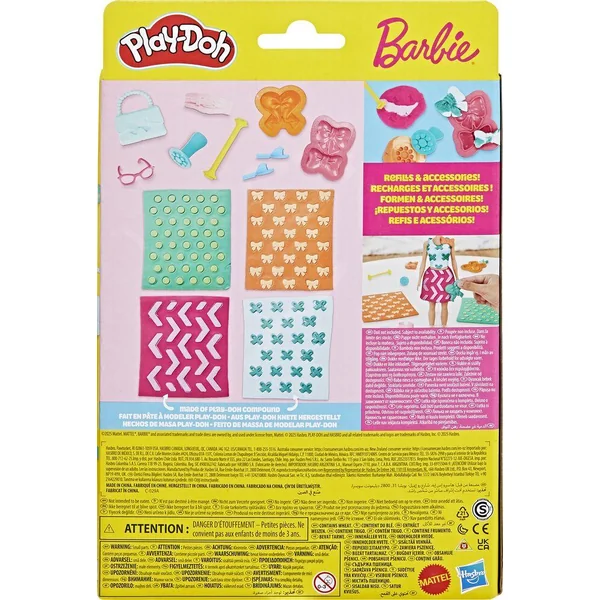 On peut créer encore plus de tenues fabuleuses avec le pack d’accessoires Perles et nœuds ! Ce pack de loisirs créatifs est l’addition parfaite à tout coffret Play-Doh Barbie (vendus séparément). Les 4 feuilles à motifs Play-Doh présentent des couleurs et des motifs amusants pour aider les enfants à créer des tenues en pâte à modeler Play-Doh pour Barbie. On peut personnaliser et accessoiriser chaque tenue avec différents éléments, comme des sandales, un sac à main, des lunettes et des nœuds Play-Doh. À la recherche de cadeaux Barbie pour les enfants, à partir de 5 ans ? Ce pack Play-Doh est le moyen parfait de stimuler l’imagination des enfants avec des loisirs créatifs inspirants ! Copyright Mattel. PLAY-DOH, HASBRO et toutes les marques et logos associés sont des marques de commerce de Hasbro, Inc.