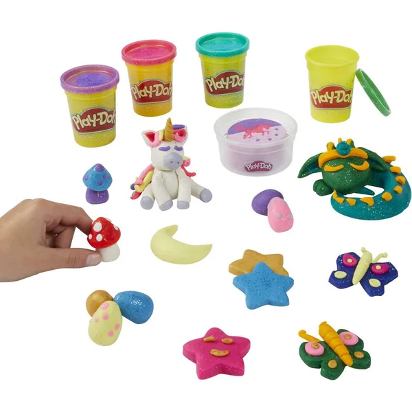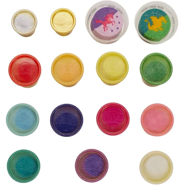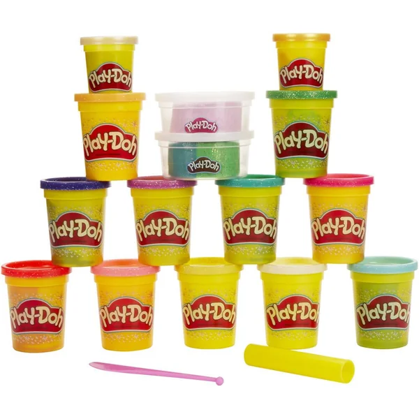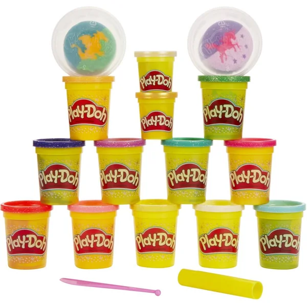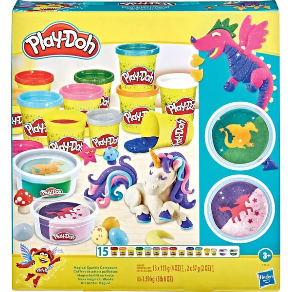 UN JEU PLAY-DOH ETINCELANT : les enfants découvrent la magie de l’imagination avec cette collection incroyable de pâtes Play-Doh : Paillette, Super Scintillante et Métallique. DES CREATURES MYTHIQUES : inclut 2 pots de pâte tricolore, incluant chacun un motif de créature fantastique fait entièrement de pâte Play-Doh. un pot inclut un dragon et l’autre, une licorne et des étoiles. PLUS DE 1,5 kg DE PATE SCINTILLANTE : Inclut 15 pots de pâte de couleurs vives et scintillantes comme le bleu saphir et le vert émeraude Super Scintillants, l’or et l’argent Métallique, et le blanc Paillette. UN SUPER CADEAU : cet assortiment de couleurs splendides est parfait pour les activités artistiques, les après-midis entre copains, les activités en classe et les cadeaux d’anniversaire. C’est le cadeau idéal pour les enfants (à partir de 3 ans) LA QUALITÉ PLAY-DOH : La pâte à modeler Play-Doh est la préférée de tous depuis 1956 ! Elle est principalement faite d’eau, de sel et de farine (contient du blé), et subit des tests rigoureux pour être toujours de qualité et amusante. Contenu : 15 pots de pâte à modeler pailletées et métalliques dont 2 pots de pâte tricolore avec motif, 1 couteau et 1 rouleau.