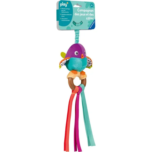 Qu’est-ce qui fait du bruit ? Lorsque les bébés secouent le hochet, ils entendent un doux son d’oiseau. La forme de l’anneau en bois est idéale pour les petites mains. Pour les bébés, saisir et secouer est un vrai plaisir .Leur motricité fine est ainsi stimulée.Les rubans colorés à toucher permettent de découvrir de nouveaux sens.Grâce à sa taille pratique, le hochet est toujours à portée de main. Il peut être fixé à la poussette ou au cosy à l’aide de l’anneau en plastique. Avec notre nouvelle gamme de jouets et de livres Play+ pour les enfants de 0 à 3 ans, nous proposons des produits adaptés à la petite enfance combinée à l’expérience de Ravensburger. Développés avec l’exigence de qualité de Ravensburger, nos livres et jouets plaisent aux enfants tout en leur permettant d’apprendre et de découvrir en s’amusant.Notre approche du jeu nous a amené à définir une gamme qui répond également aux besoins des parents, et chaque produit a un plus !