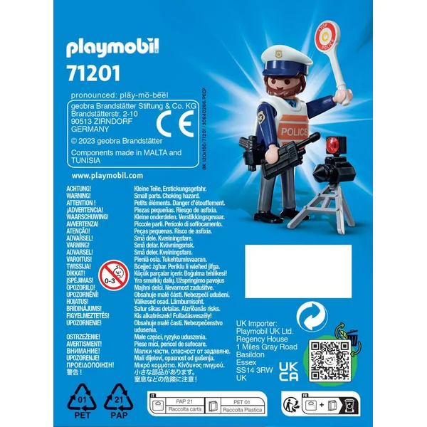 Le policier Playmobils contrôle la vitesse des automobilistes pour protéger la population et stopper les excès de vitesse. Contient un personnage et un radar. 10 pièces.