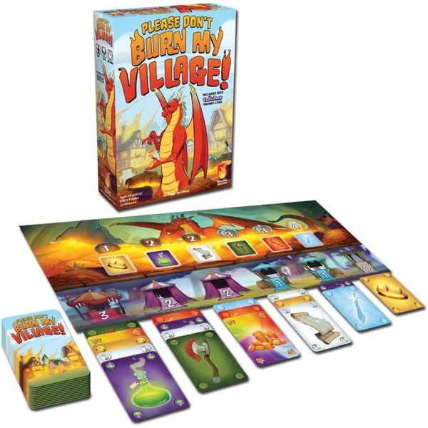 Please Don’t Burn My Village! propose une fin de partie où l’on tente sa chance : chaque fois qu’un joueur soudoie le dragon, des cartes sont retournées et placées sur les cases du marché noir jusqu’à ce qu’une carte correspondante ou un joker soit révélé.