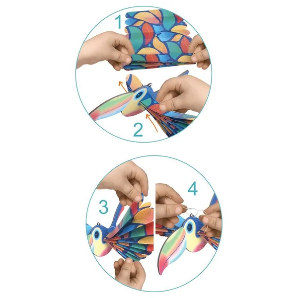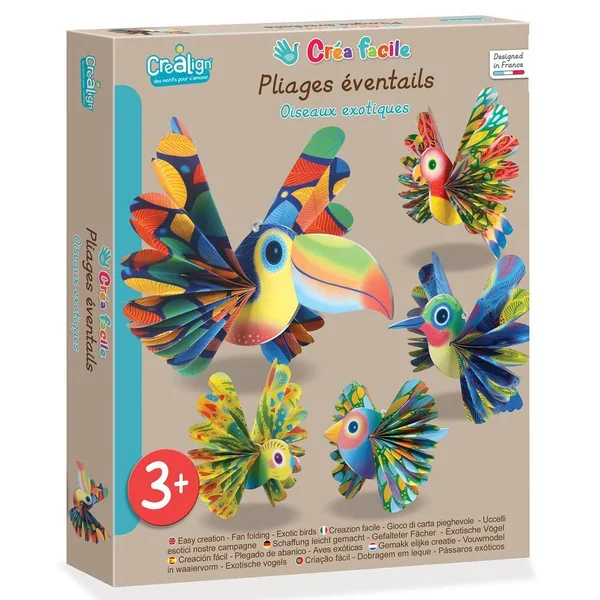 Un coffret conçu pour les jeunes enfants afin de découvrir la technique du pliage éventail. Les enfants s’amuseront à plier les bandes de papier dans un sens puis dans un autre et ainsi ils obtiendront de beaux oiseaux exotiques (un toucan, une perruche, un diamant de gould, un colibri et un perroquet). Ils pourront ensuite décorer un bureau ou bien une étagère et les imaginatifs pourront se créer des histoires en s’amusant. Un coffret contenant des bandes de papier colorée et imprimée que l’enfant devra plier dans un sens puis dans un autre afin de former un pliage en éventail. Pour terminer chaque personnage il insérera les ailes à l’intérieur de chaque oiseau. Il pourra ensuite les suspendre à l’aide d’un fil. Contient : 5 oiseaux en carton épais pré-découpé, 5 bandes de papier colorées et imprimées et une notice pas à pas illustrée (français et anglais).