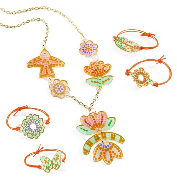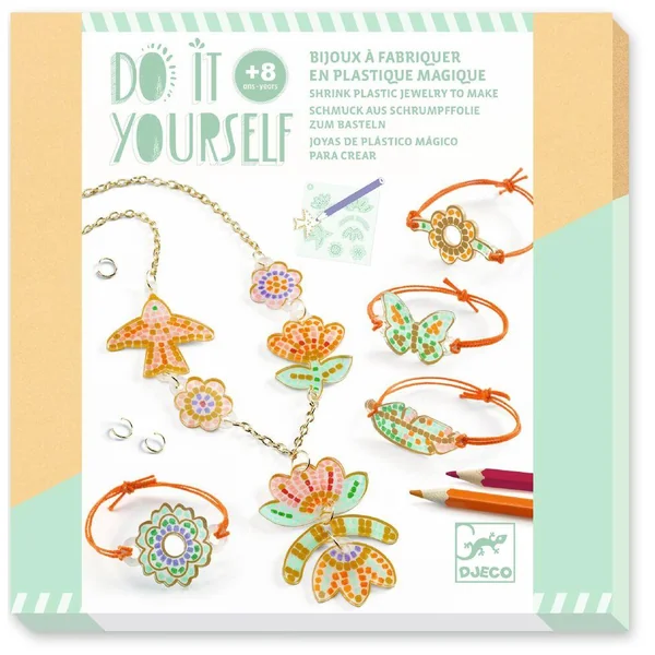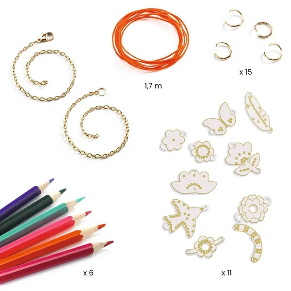 Ce kit créatif permet de fabriquer un ensemble unique composé d’un collier et de 4 bracelets en plastique rétractable. À l’aide des modèles de coloriages et des crayons de couleur fournis, on colorie de manière pointilliste les formes en plastique transparent, on les passe au four, et après quelques minutes elles réduisent de 7 fois leur taille. Il n’y a plus qu’à les assembler pour créer un collier au design délicat et des bracelets assortis à empiler ou à offrir !