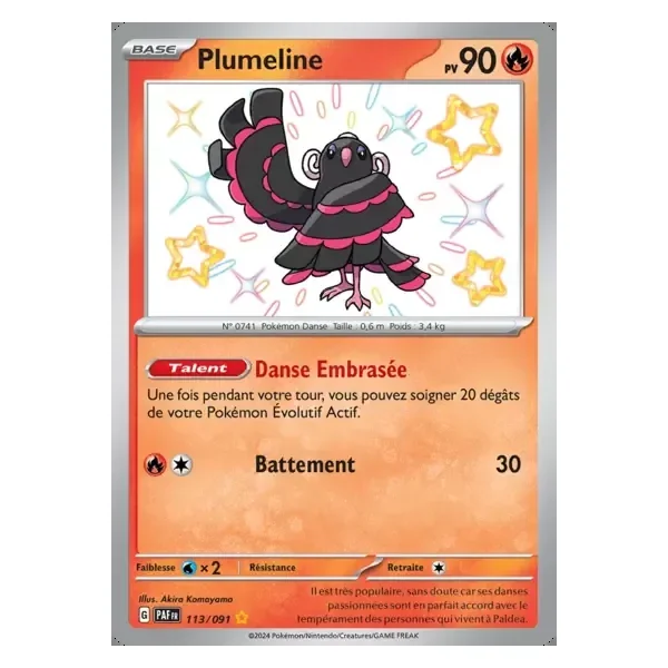 Découvrez Plumeline (paf113), une carte Pokémon de l’extension Destinées de Paldea, provenant du bloc Écarlate & Violet. Idéale pour compléter votre collection, cette carte Shiny Rare plaira autant aux collectionneurs qu’aux joueurs.