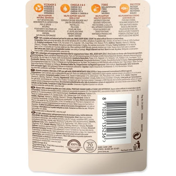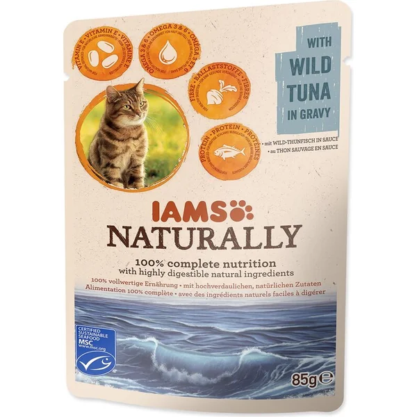 Aliment pour chats adultes – IAMS thon en sauce 85g.