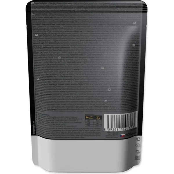 Aliment complet et équilibré pour les chats stérilisés à partir d’un an sous forme de sachet avec du poulet et des carottes dans une sauce.