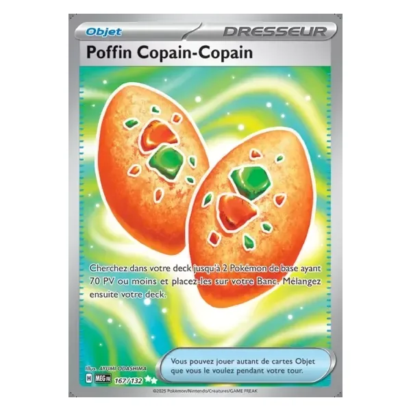 Découvrez Poffin Copain-Copain (meg167), une carte Pokémon de l’extension Mega Evolution, provenant du bloc Méga-Évolution. Idéale pour compléter votre collection, cette carte Ultra Rare plaira autant aux collectionneurs qu’aux joueurs.