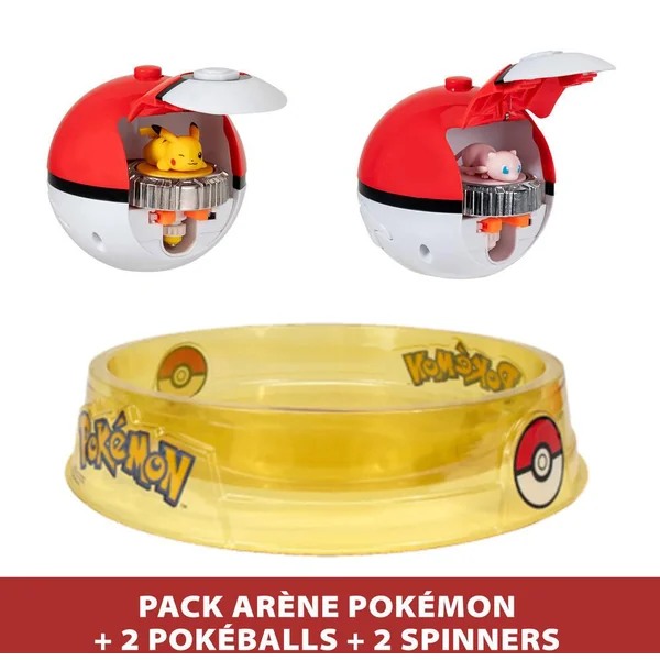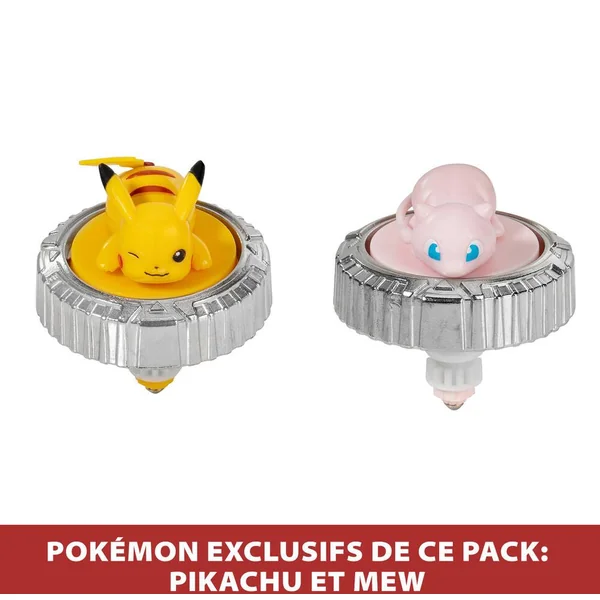 Défis tes adversaires dans l’Arène Pokémon ! Avec 2 Pokéball lanceurs et 2 spinners Pikachu et Mew.