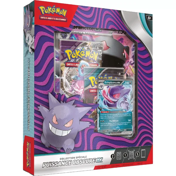 Découvrez le Coffret EX Puissance Obscure, une collection redoutable mettant en avant Éctoplasma EX, Absol EX et Branette EX, accompagnée de 5 boosters Pokémon.