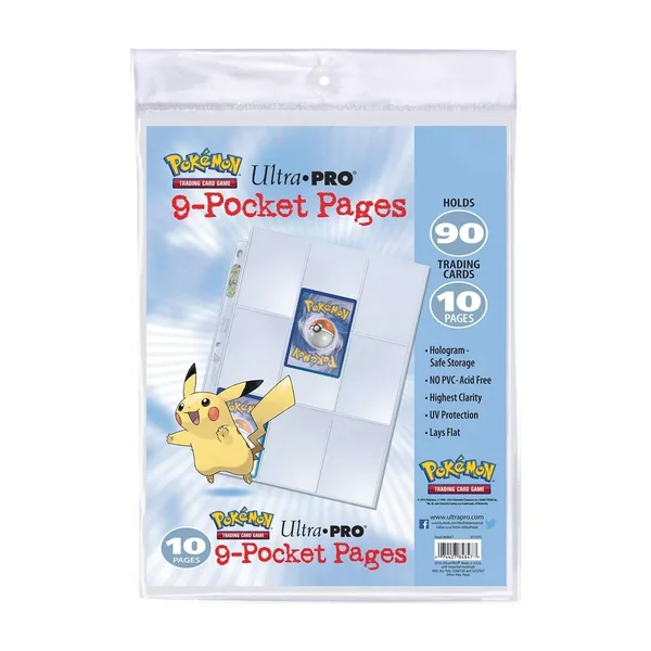 Pokémon : Paquet de 10 feuilles de classeur de la marque Ultra Pro (référence : 84847) est un pack de pages de classeur transparentes de 9 pochettes d’une capacité jusqu’à 90 cartes (recto) ou 180 cartes (recto-verso).