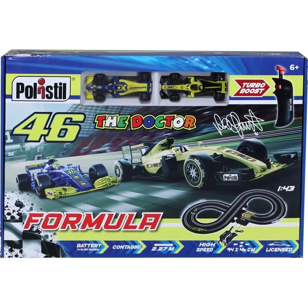 Piste électrique de Formule 1 de la célèbre marque Polistil, mais adaptée au style de Valentino Rossi 46 The Doctor. La piste se compose d’un classique 8. Il s’agit d’une piste électrique contrôlée par un transformateur et comme indiqué sur la photo, elle comprend deux voitures personnalisées.