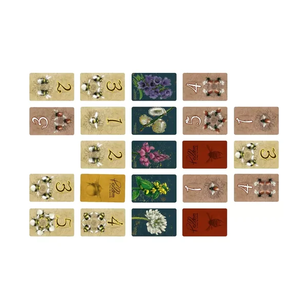 Dans Pollen, deux pollinisateurs – Abeilles contre Bourdons – s’affrontent pour récolter les fleurs les plus lucratives. Chaque joueur dispose de 2 points d’action par tour pour poser, déplacer, dissimuler ou révéler des cartes dans son propre camp ou celui de l’adversaire.