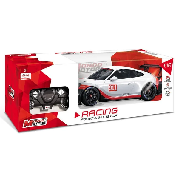Réplique radiocommandée de la Porsche 911, dans sa version course (GT3 Cup). Echelle : 1/18ème. Commande toutes directions : avant, arrière, gauche et droite. Vitesse : 9km/h. 2 fréquences. Carrosserie : Hard Body.