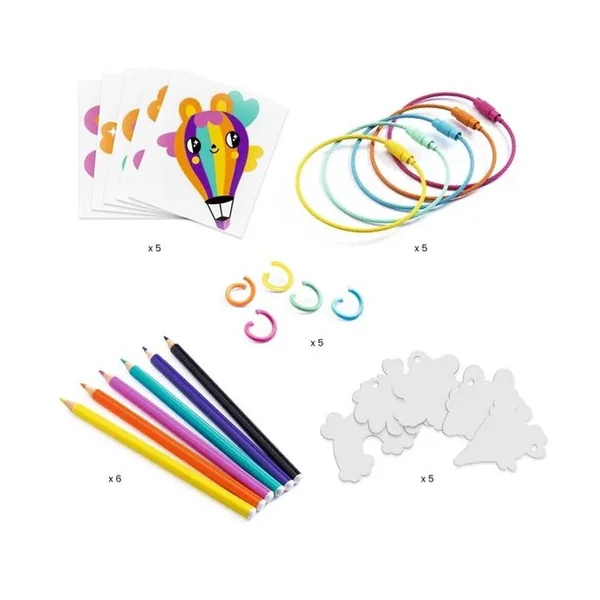 Ce kit propose à l’enfant de créer cinq porte-clefs avec d’adorables personnages Kawai à partir de plastique rétractable ! Pour cela, il place le modèle sous la forme en plastique transparente correspondante et reproduit le modèle avec les crayons de couleur. Une fois passées au four, la magie opère : les pièces rétrécissent en quelques secondes et le plastique devient rigide et épais. Il ne reste qu’à accrocher les réalisations aux anneaux colorés pour créer de beaux porte-clefs.