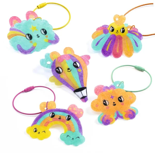 Ce kit propose à l’enfant de créer cinq porte-clefs avec d’adorables personnages Kawai à partir de plastique rétractable ! Pour cela, il place le modèle sous la forme en plastique transparente correspondante et reproduit le modèle avec les crayons de couleur. Une fois passées au four, la magie opère : les pièces rétrécissent en quelques secondes et le plastique devient rigide et épais. Il ne reste qu’à accrocher les réalisations aux anneaux colorés pour créer de beaux porte-clefs.