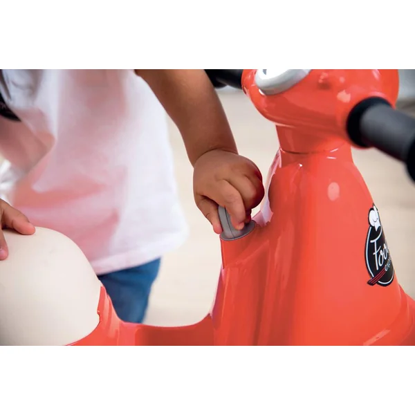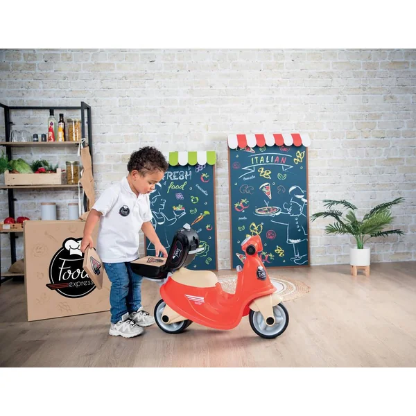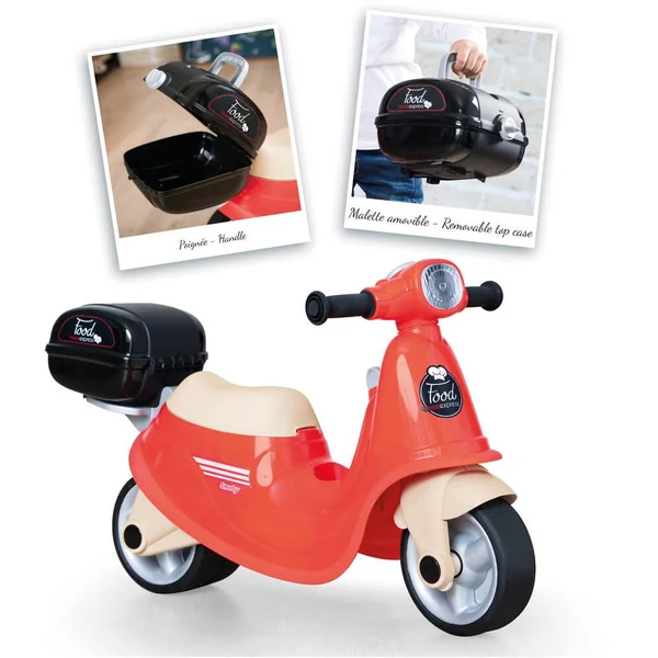 Il est composé de : 2 roues silencieuses, 1 porte-bagage avec 1 top case amovible, 1 phare avant réaliste, 1 clé mécanique, 1 coffre à jouets sous le siège. L’enfant peut alors jouer à préparer toutes sortes de repas et à les livrer à l’arrière de son scooter grâce au top case amovible.