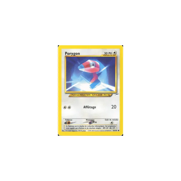 Découvrez Porygon (nde078), une carte Pokémon de l’extension Neo Destiny, provenant du bloc Wizards. Idéale pour compléter votre collection, cette carte Commune plaira autant aux collectionneurs qu’aux joueurs.