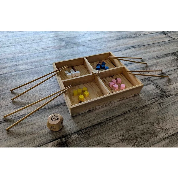 Le principe est simple : à l’aide de baguettes, les joueurs doivent déposer leurs cubes sur une pile centrale sans la faire tomber.