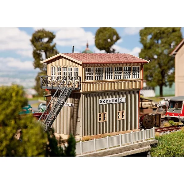 Poste d’aiguillage en construction du bois avec montée extérieure séparée. Ce poste d’aiguillage est utilisable de différentes façons. Livré avec un vaste équipement intérieur.