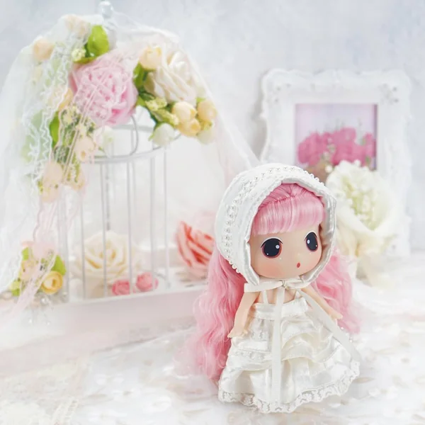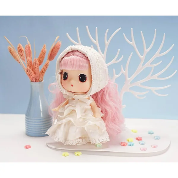 Poupée articulée de 18 cm, en vinyle. Elle porte une robe blanche, un bandeau dans ses cheveux roses, une culotte et des chaussures. Les vêtements sont amovibles. Un portant de présentation inclus permet de faire tenir la poupée debout. Licence : Ddung.
