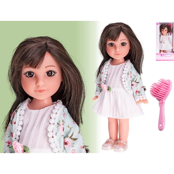 La belle poupée de mode a un corps rigide et de longs cheveux. La poupée porte une jolie robe avec un boléro. Il y a aussi une brosse rose pour peigner les cheveux.
