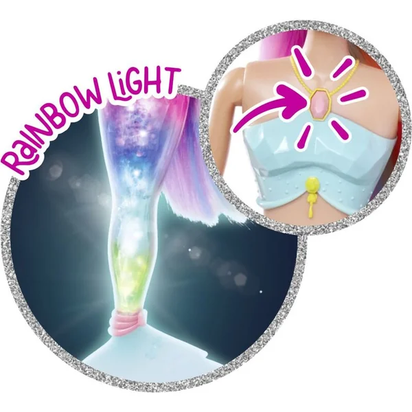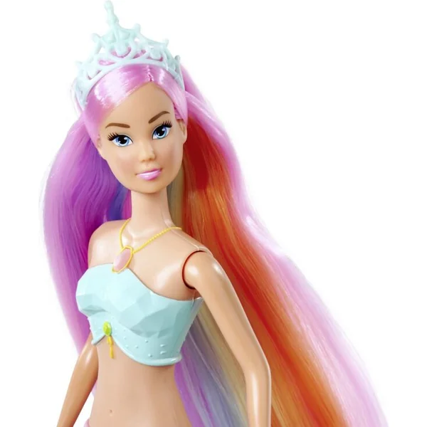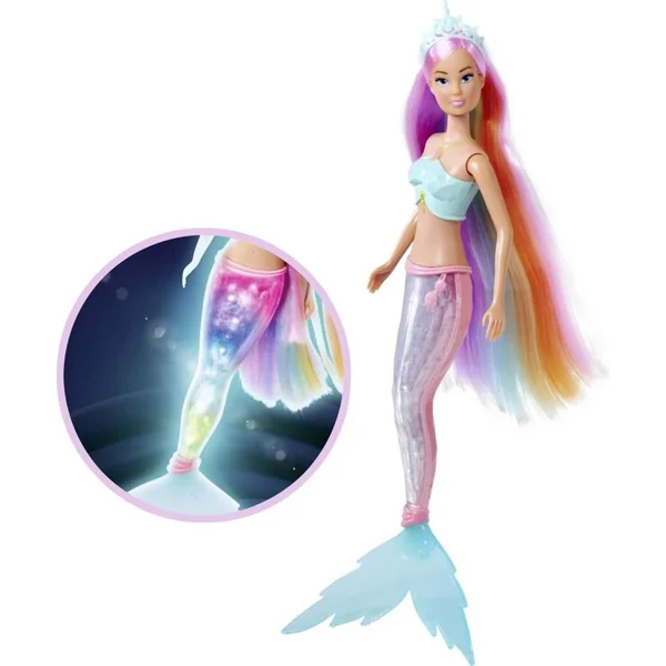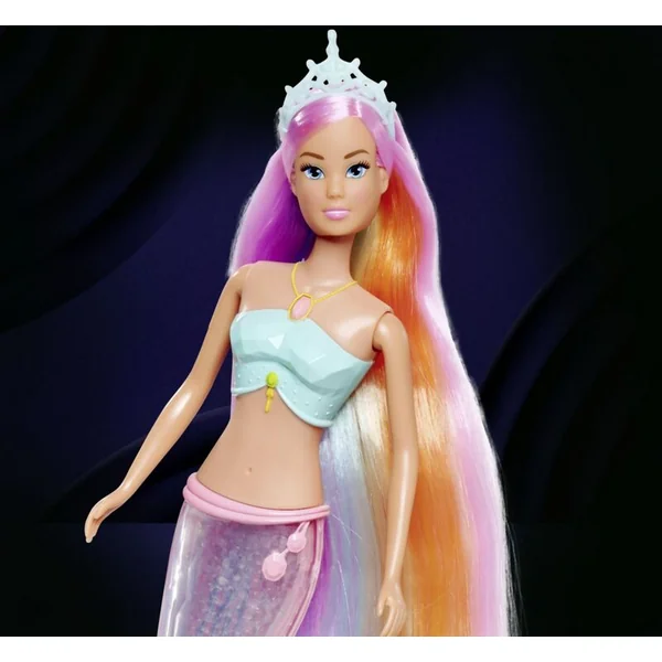 La poupée Steffi en tant que sirène avec une queue lumineuse magique et des cheveux extra longs, étanche. Hauteur de la poupée 39 cm.