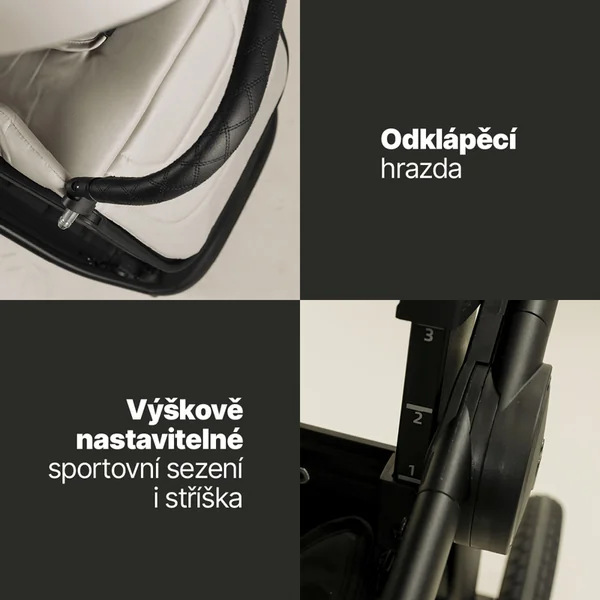 La poussette permet un siège sportif rotatif que vous pouvez orienter dans le sens ou à l’opposé de la marche. Un grand avantage est le siège et le canopy réglables en hauteur, chacun sur trois niveaux. Elle s’adapte ainsi non seulement à la taille des parents, mais aussi à la croissance de l’enfant.