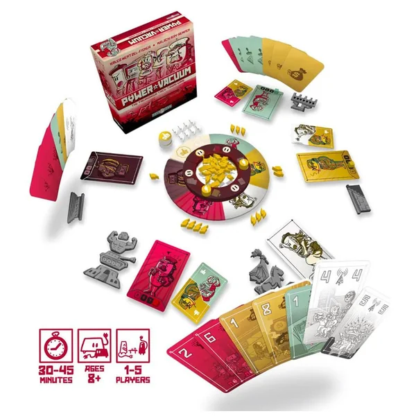 Le pouvoir est acquis en remportant des plis avec le plus grand nombre de cartes de la couleur menée, mais il est également gagné, perdu et échangé entre les joueurs grâce à l’utilisation astucieuse du tableau de contrôle, qui est manipulé par le joueur de la carte la plus basse de N’IMPORTE QUELLE couleur. Si, à la fin du tour, vous avez rempli votre carte Agenda, en choisissant avec succès les joueurs ayant le plus et/ou le moins de pouvoir, vous obtenez un bonus important.