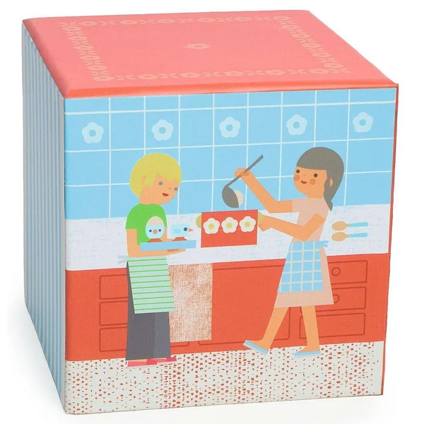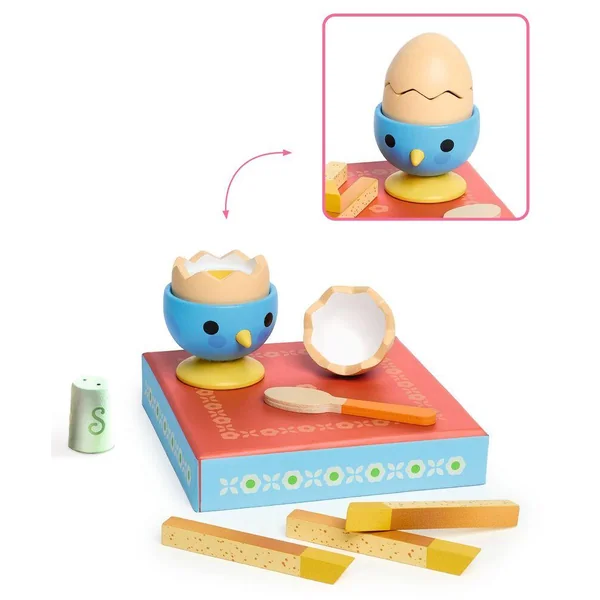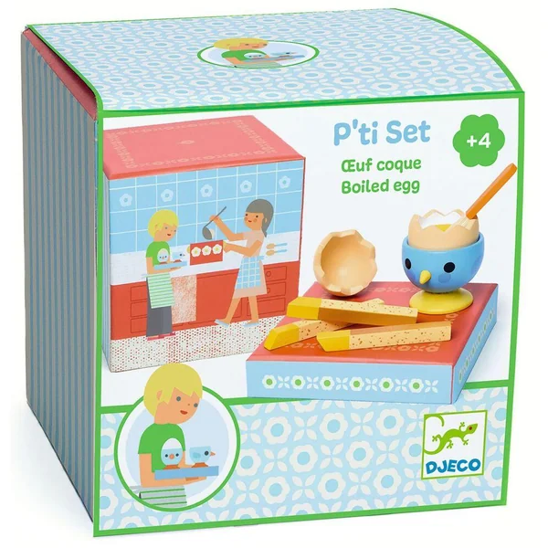 Les œufs à la coque, un régal ! Ce ravissant coffret d’accessoires en bois et feutrine invite les enfants à préparer un délicieux œuf à la coque accompagné de ses mouillettes. L’enfant pourra s’amuser à ouvrir son œuf, à le déposer dans son coquetier, à tremper les mouillettes. La jolie boîte illustrée d’une scène gourmande d’enfants dans leur cuisine crée une atmosphère chaleureuse et familiale.