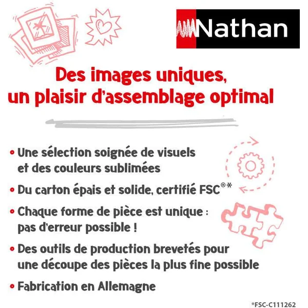 A travers huit collections Evasion, Urbain, Tendresse, Vie sauvage, Artiste, Nostalgie, Photo d’Art et Mes Héros, Nathan dévoile une sélection raffinée d’images inédites et originales, pour répondre à toutes les envies de puzzle. Forte de son savoir-faire dans le livre, la marque Nathan élabore ses puzzles à partir d’images choisies avec le plus grand soin, pour leur qualité, leur dimension symbolique ou les émotions qu’elles suscitent. Pour les puzzleurs entraînés, le format 1000 pièces est idéal pour profiter de cette activité, propice au calme et à la relaxation.