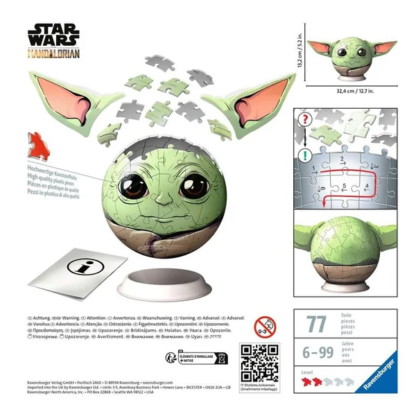 Un puzzle 3D rond aux couleurs du célèbre personnage Grogu de l’univers Star Wars The Mandalorian facile à assembler grâce à ses 72 pièces numérotées. Toutes les pièces s’emboitent parfaitement et une fois monté, le puzzle 3D reste bien stable, sans avoir besoin d’être collé.