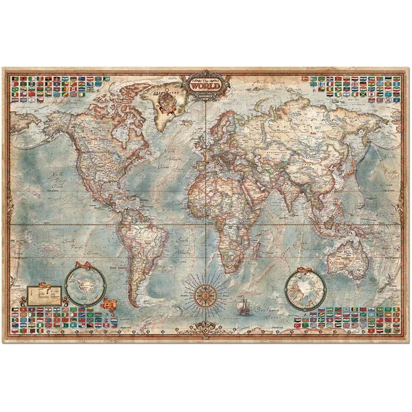 Puzzle qui consiste en une représentation de la carte politique du monde. Il a tous les drapeaux des pays du monde dans les 4 coins. Comprend « puzzle fixe » pour fixer les pièces et ensuite être en mesure de l’encadrer.