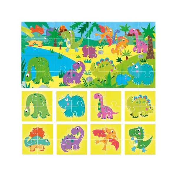 De grandes pièces double-face très résistantes pour jouer et faire de nombreuses découvertes. D’un côté, l’enfant assemble 8 dinosaures amusants et de l’autre une magnifique scène préhistorique.