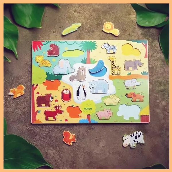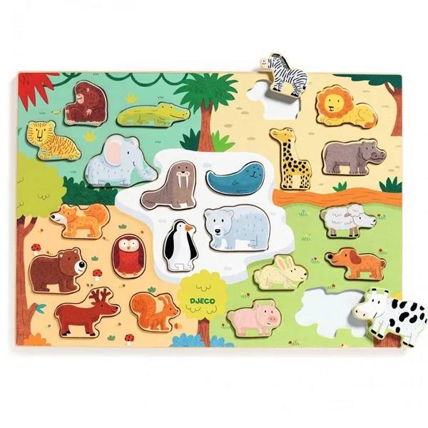 Un puzzle en bois sur le thème des animaux. L’enfant place les 22 animaux en reconnaissant sur le plateau leur silhouette et leur milieu.