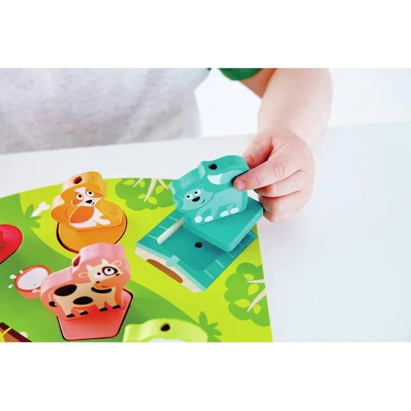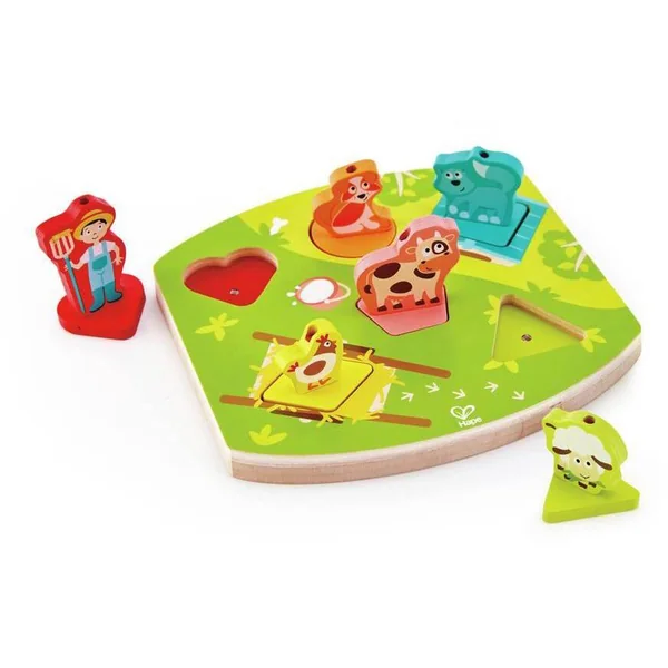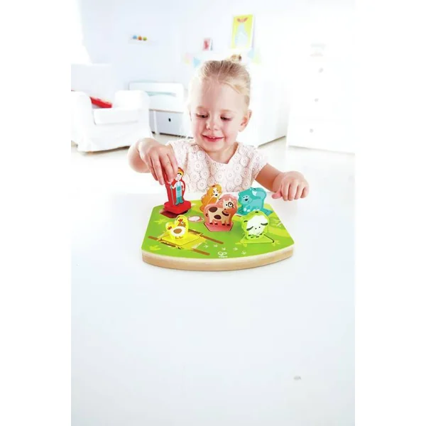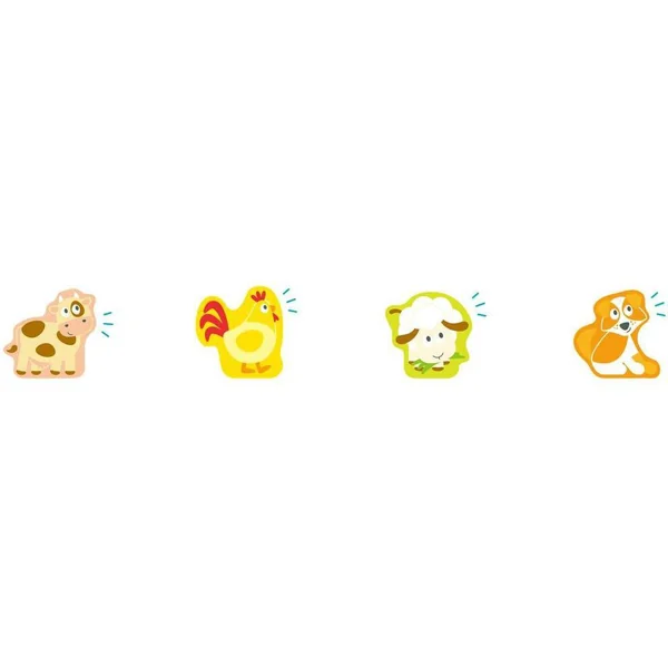 Assemble le puzzle Bruits de la ferme en plaçant les pièces représentant des animaux de la ferme en fonction de leur couleur, de leur forme et de leur bruit caractéristique et invente ta propre histoire au fil du jeu !