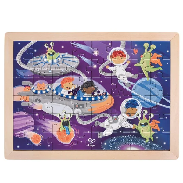 Explore les galaxies les plus lointaines avec ce puzzle cosmique de 48 pièces. Il met en scène un équipage d’astronautes à bord de leur vaisseau spatial ainsi que de sympathiques aliens et de nombreuses étoiles scintillantes. Il y a également un côté vierge au verso pour que tu puisses colorier ton propre puzzle. Ce puzzle est livré avec un plateau en bois et un poster de référence.